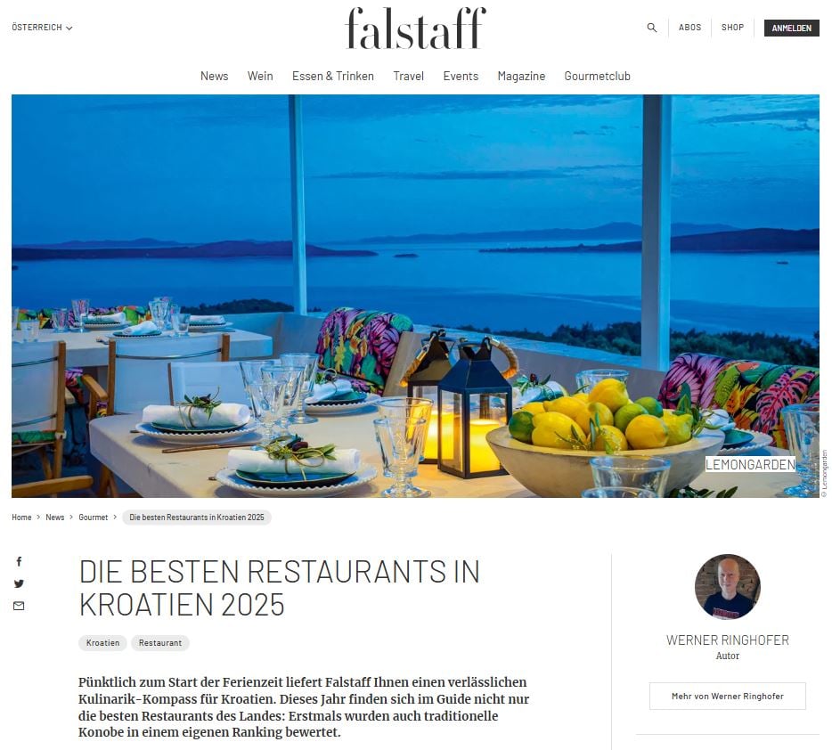 Tako je Falstaff, u suradnji s Hrvatskom turističkom zajednicom, u svom gastro vodiču za Hrvatsku (njem. Internationalen Restaurantguide Kroatien) na jednom mjestu okupio najbolje gastronomske adrese u našoj zemlji.