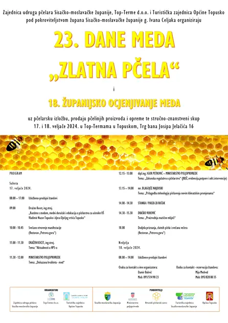 23. Dani meda „Zlatna pčela“ i 18. Županijsko ocjenjivanje meda održat će se 17. i 18. veljače 2024. u Top-Termama Topusko. Program počinje u subotu od 8 sati, od kada će svi zainteresirani moći posjetiti izložbeno-prodajne štandove, nakon čega u 9 sati počinje edukativna radionica za djecu pod nazivom „Rastimo s medom“. Mališani će se moći i zasladiti uz medni doručak.