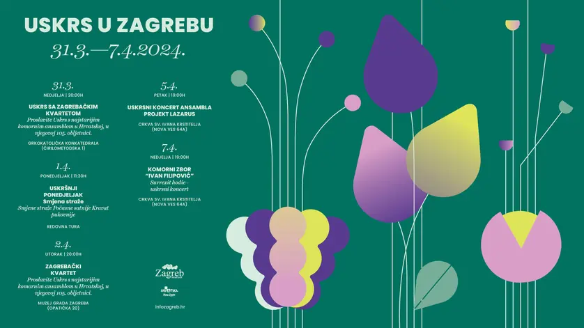 Turistička zajednica grada Zagreba (TZGZ) i ove godine, s prigodnim koncertima, obilježava Uskrs i uskrsne blagdane u glavnom gradu Hrvatske. Tako će, u periodu od 31. ožujka do 7. travnja, na različitim lokacijama nastupiti glazbenici i ansambli koji će svim posjetiteljima pružiti priliku da uživaju u bogatoj glazbenoj baštini. Ulazi na sve koncerte su besplatni, a program događanja je kako slijedi: