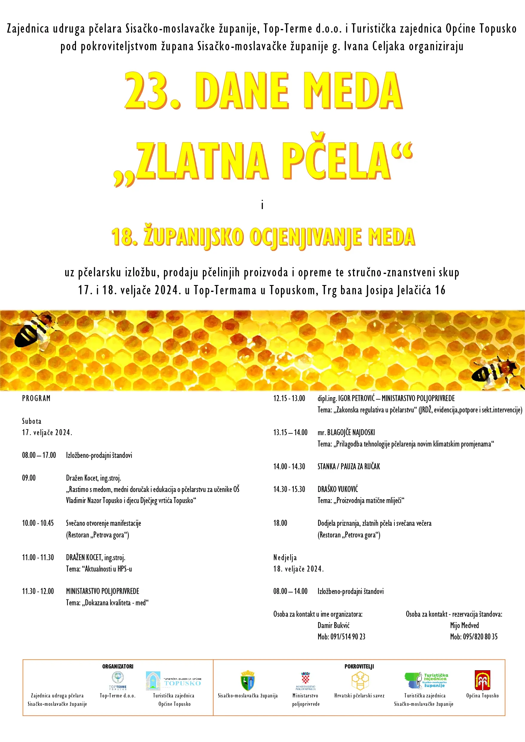 Od 17. do 18. veljače 2024. u Topuskom će biti održana manifestacija Dani meda „Zlatna pčela“ i 18. Županijsko ocjenjivanje meda. Posjetitelji će moći uživati uz pčelarsku izložbu, prodaju pčelinjih proizvoda i opreme te sudjelovanjem na stručno-znanstvenim skupovima.